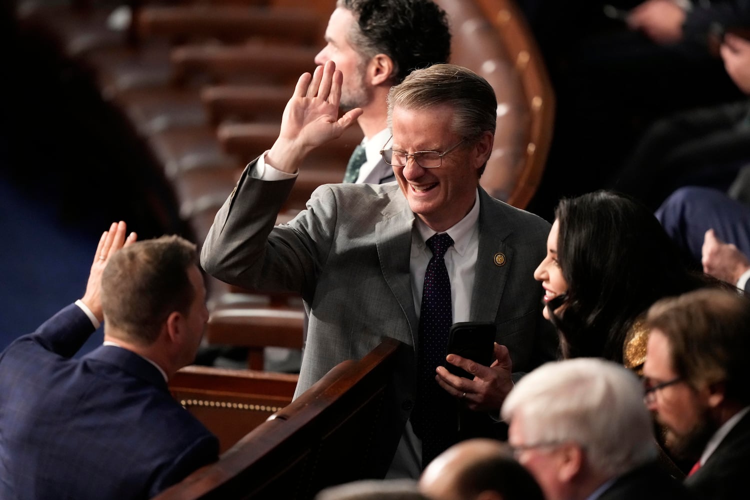 Payton McNabb, left, claps as second lady Usha Vance watches during President Donald Trump's address to a joint session of Congress at the Capitol in Washington, Tuesday, March 4, 2025. (AP Photo/Alex Brandon)