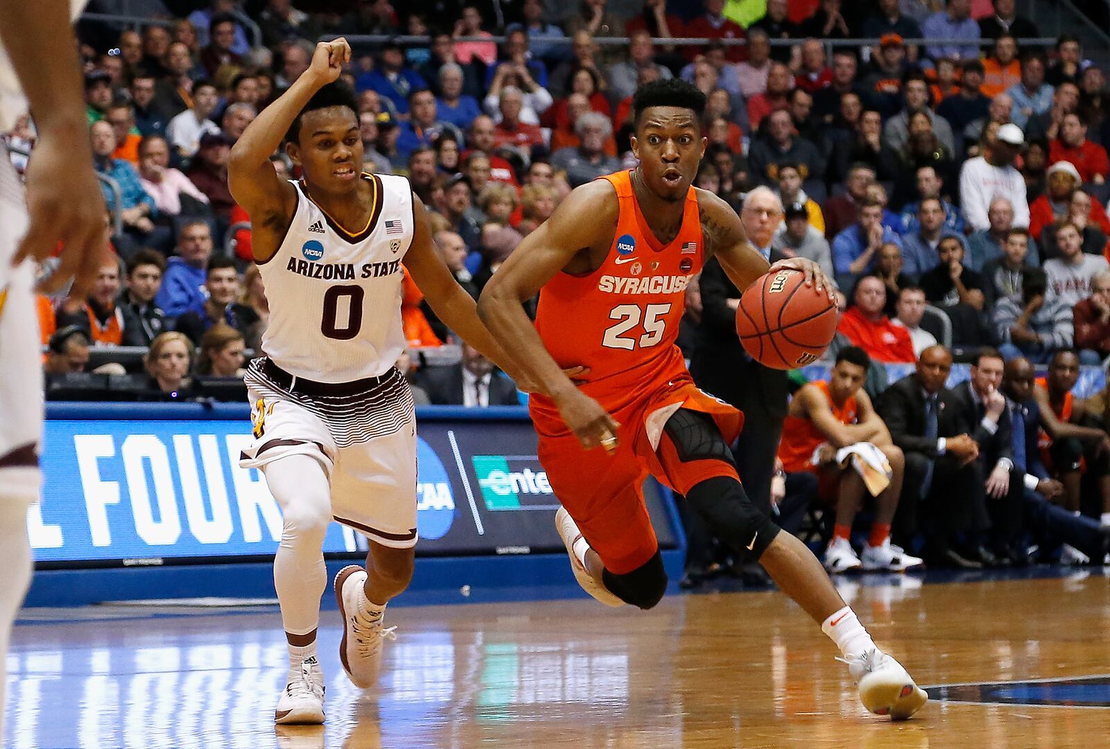 Syracuse, the last at-large team picked for the 68-team field, began a Sweet 16 run by overcoming a seven-point deficit in the final seven minutes to win this game. Freshman Oshae Brissett led the Orange with 23 points and 12 rebounds.
