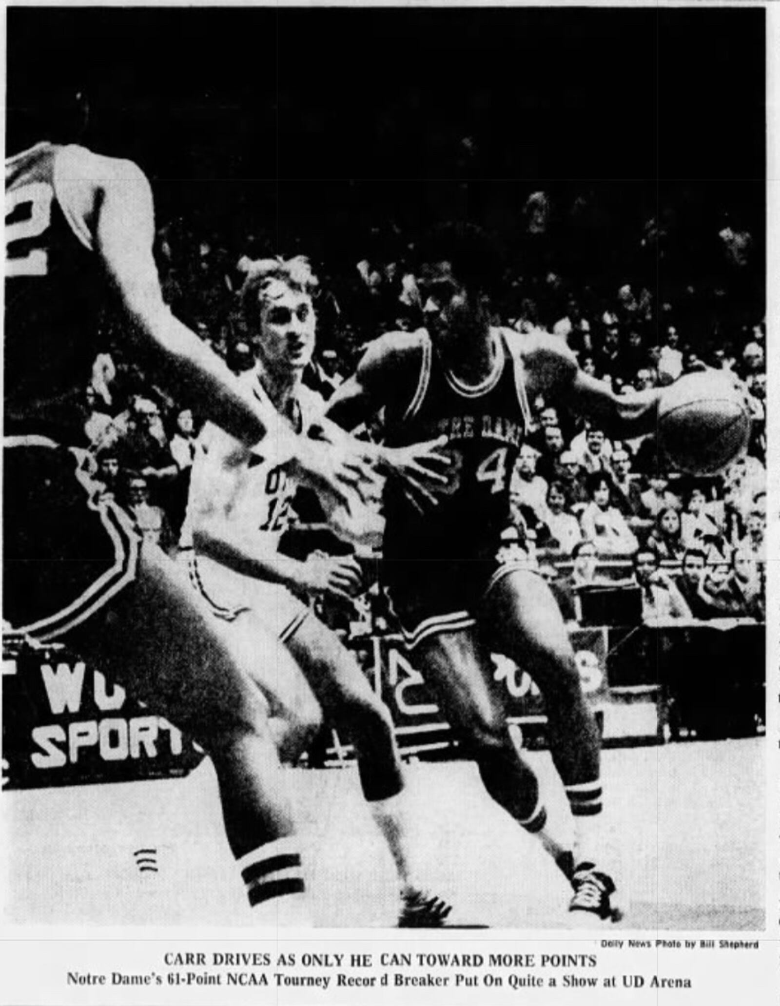 Notre Dame’s Austin Carr set a NCAA tournament record by scoring 61 points. He made 25 of 44 field goals and 11 of 14 free throws. He scored 52 points against Texas Christian in the first round a year later. He owns the two highest-scoring games in tournament history. Notre Dame also still holds the UD Arena record for most points scored in a NCAA tournament game.
