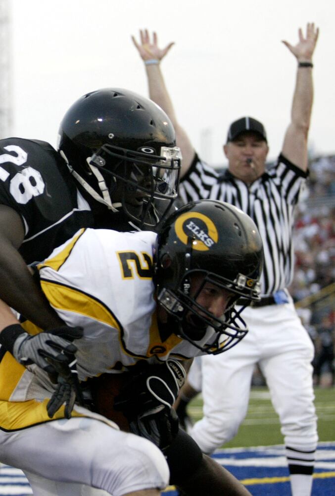 Former Roth HS, Ohio State and NFL star Keith Byars shakes hands with the Meadowdale and Dunbar captains at the beginning of their game in October 2002 at Welcome Stadium. Byars was also working to support a major school levy on that November's ballot. Dayton Daily News file photo by Jan Underwood