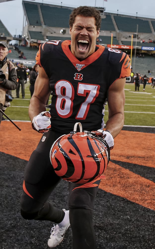 CINCINNATI, OH - DECEMBER 01: C.J. Uzomah #87 of the Cincinnati Bengals celebrates after picking their first win of the season against the New York Jet at Paul Brown Stadium on December 1, 2019 in Cincinnati, Ohio. (Photo by Michael Hickey/Getty Images)