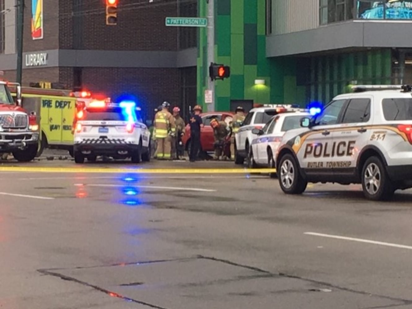 PHOTOS: Crash involving stolen police cruiser near Dayton Metro Library in Dayton