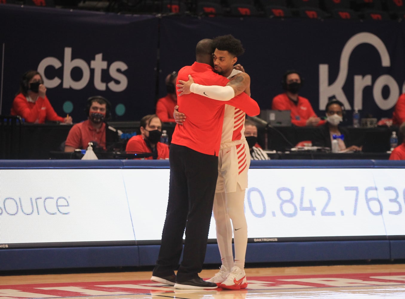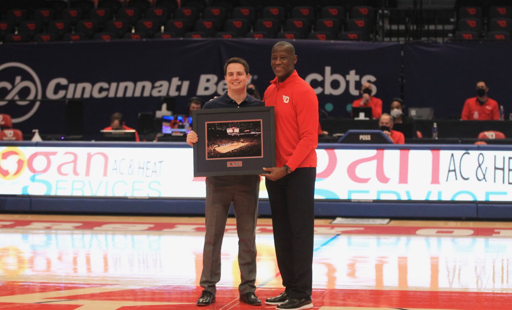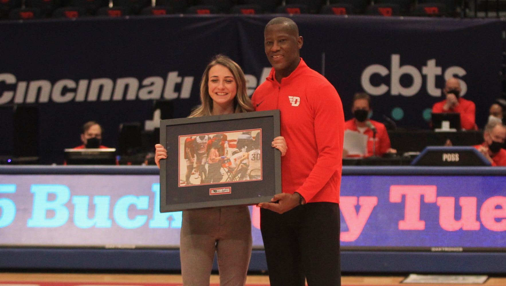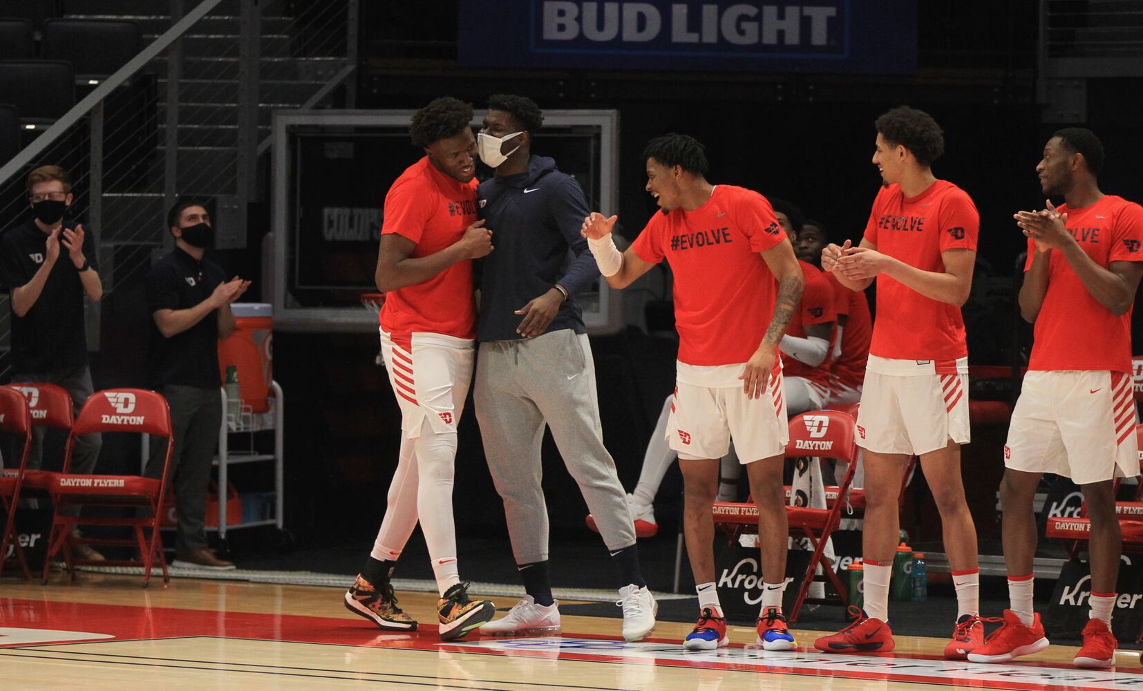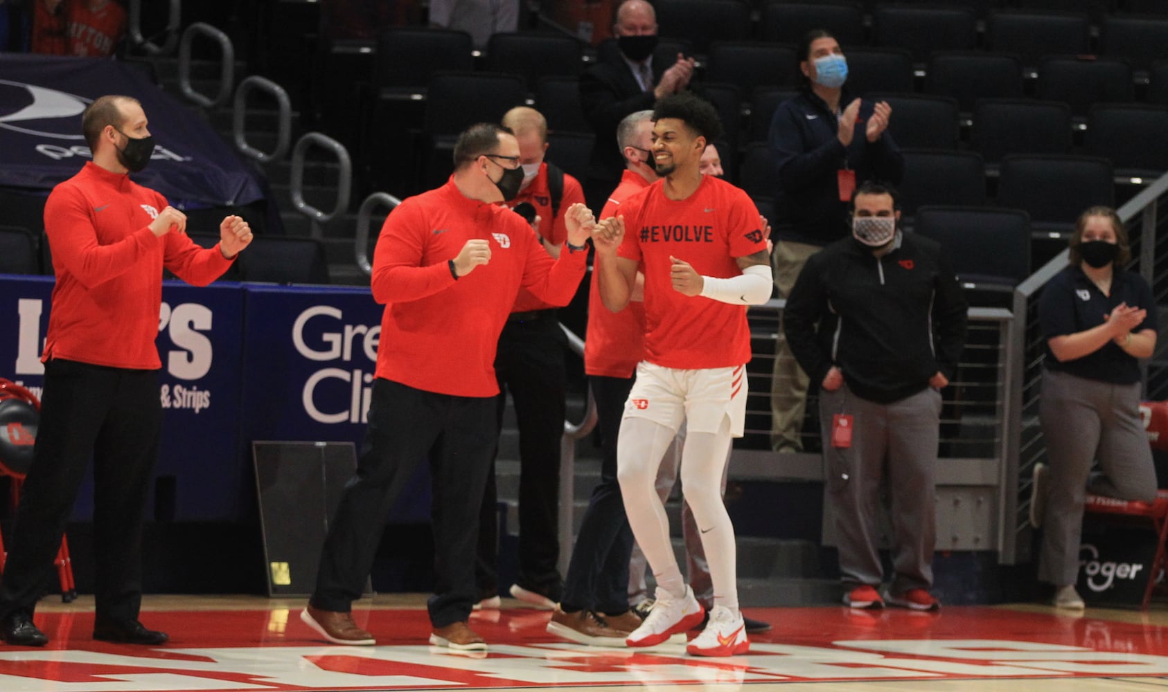 Dayton seniors (left to right) Ibi Watson, Jalen Crutcher, Rodney Chatman, Camron Greer and Jordy Tshimanga pose with coach Anthony Grant, third from left, during a Senior Night ceremony before a game against Saint Louis on Senior Night on Friday, Feb. 19, 2021, at UD Arena. David Jablonski/Staff