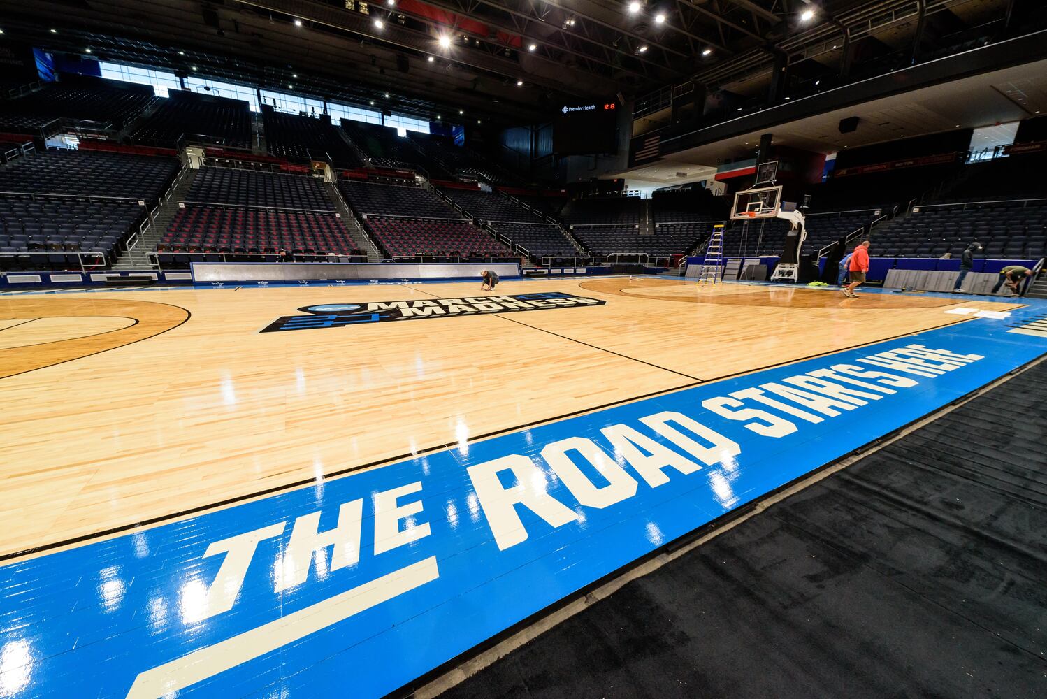 PHOTOS: NCAA First Four basketball court installation at UD Arena
