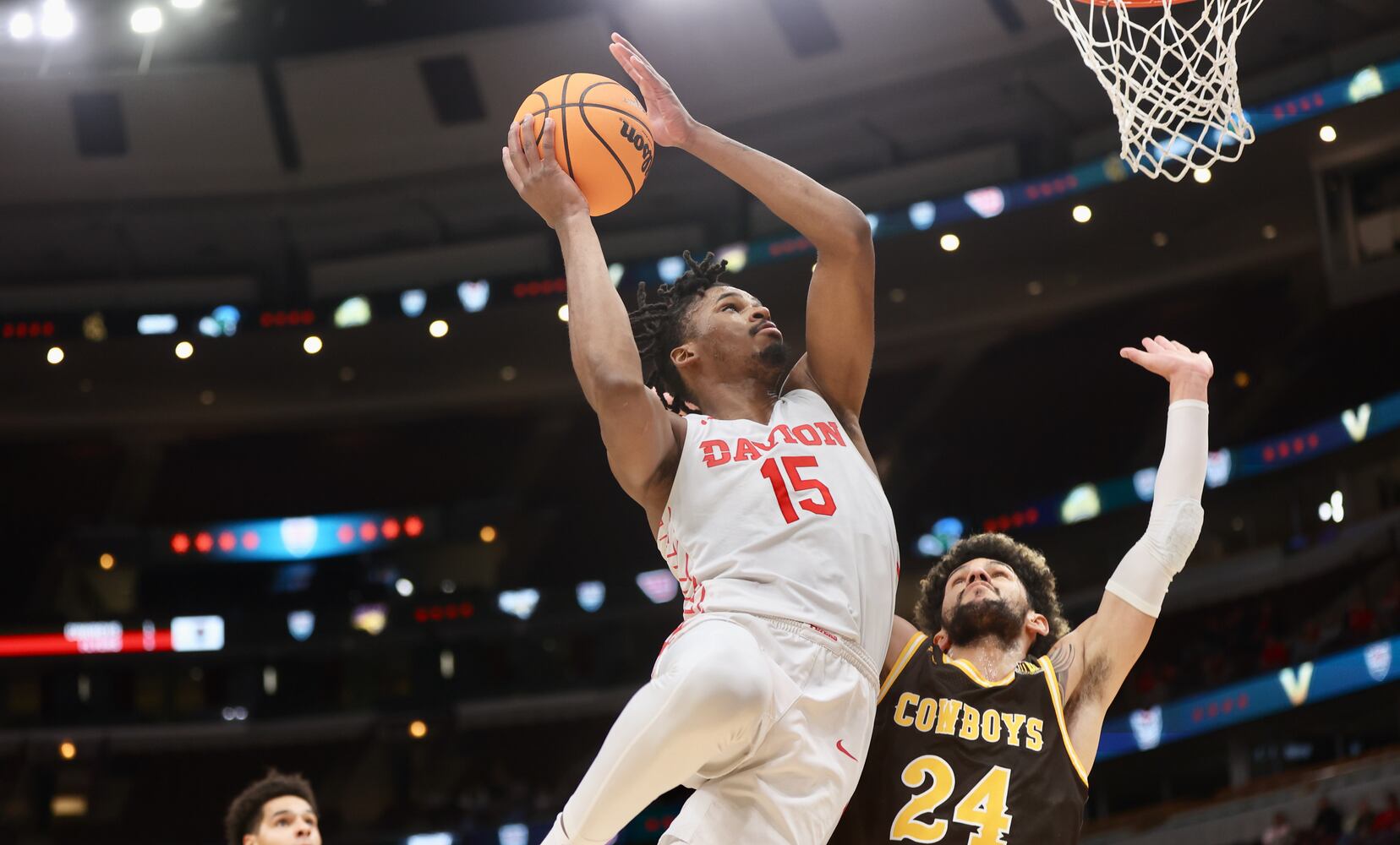 Dayton's DaRon Holmes II shoots against Wyoming in the first half on Saturday, Dec. 17, 2022, at the United Center in Chicago. David Jablonski/Staff
