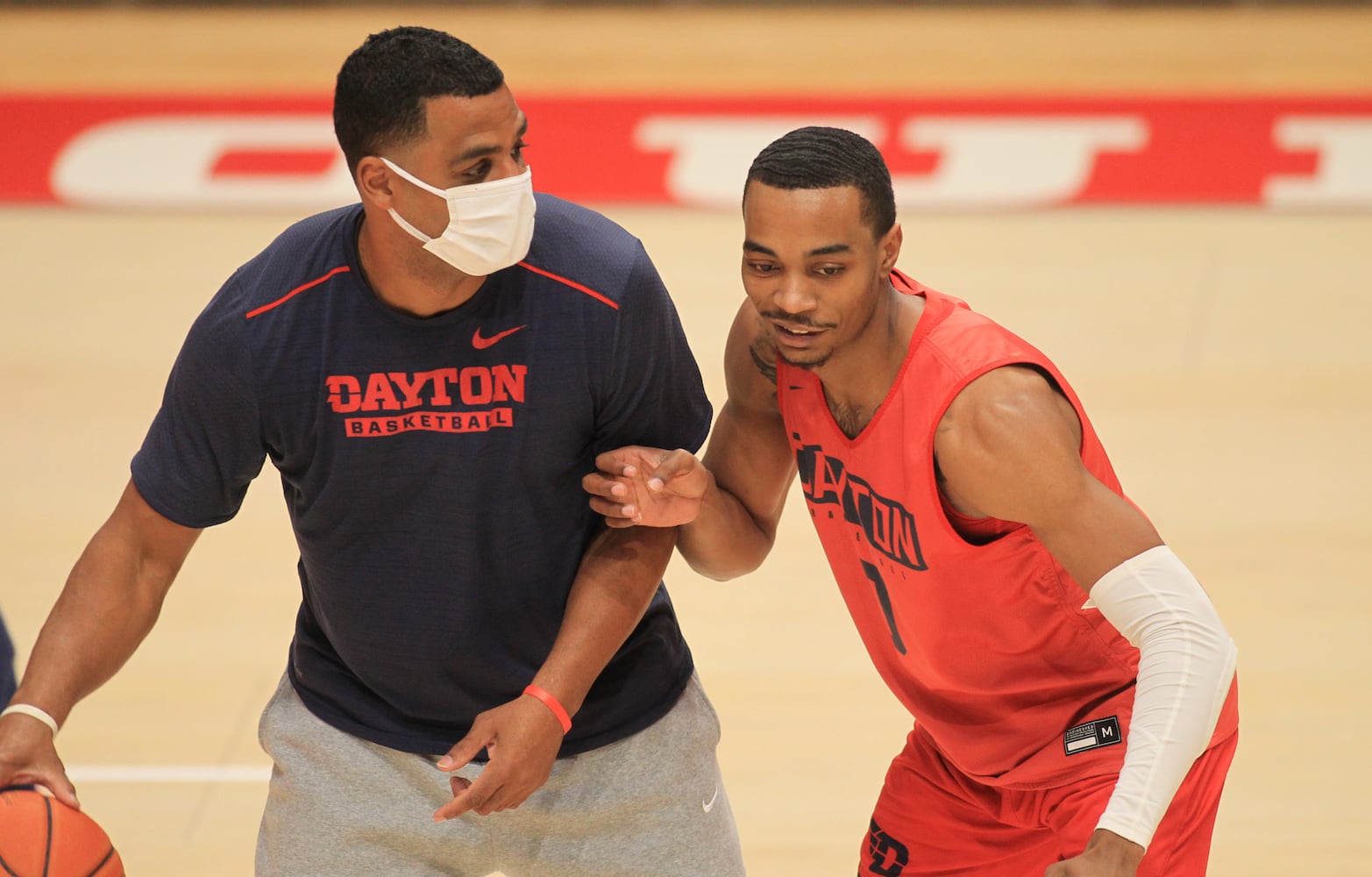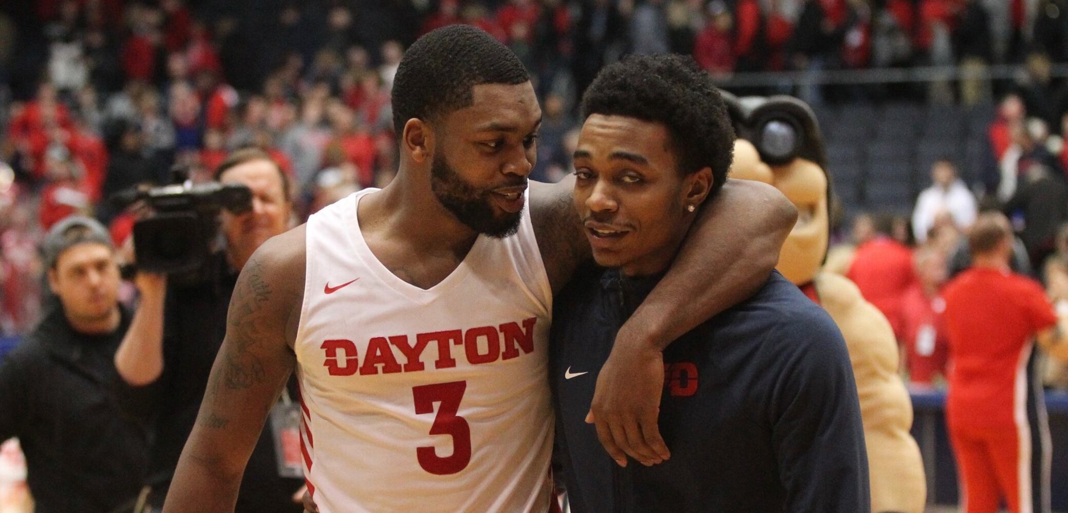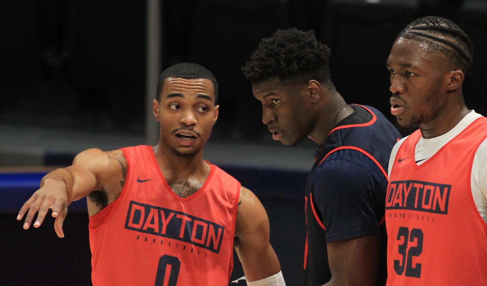 Dayton players (left to right) Chase Johnson, Ibi Watson, Rodney Chatman and Jordy Tshimanga sit on the bench, along with coach Andy Farrell, far right, against Massachusetts on Sunday, Jan. 13, 2019, at UD Arena. David Jablonski/Staff