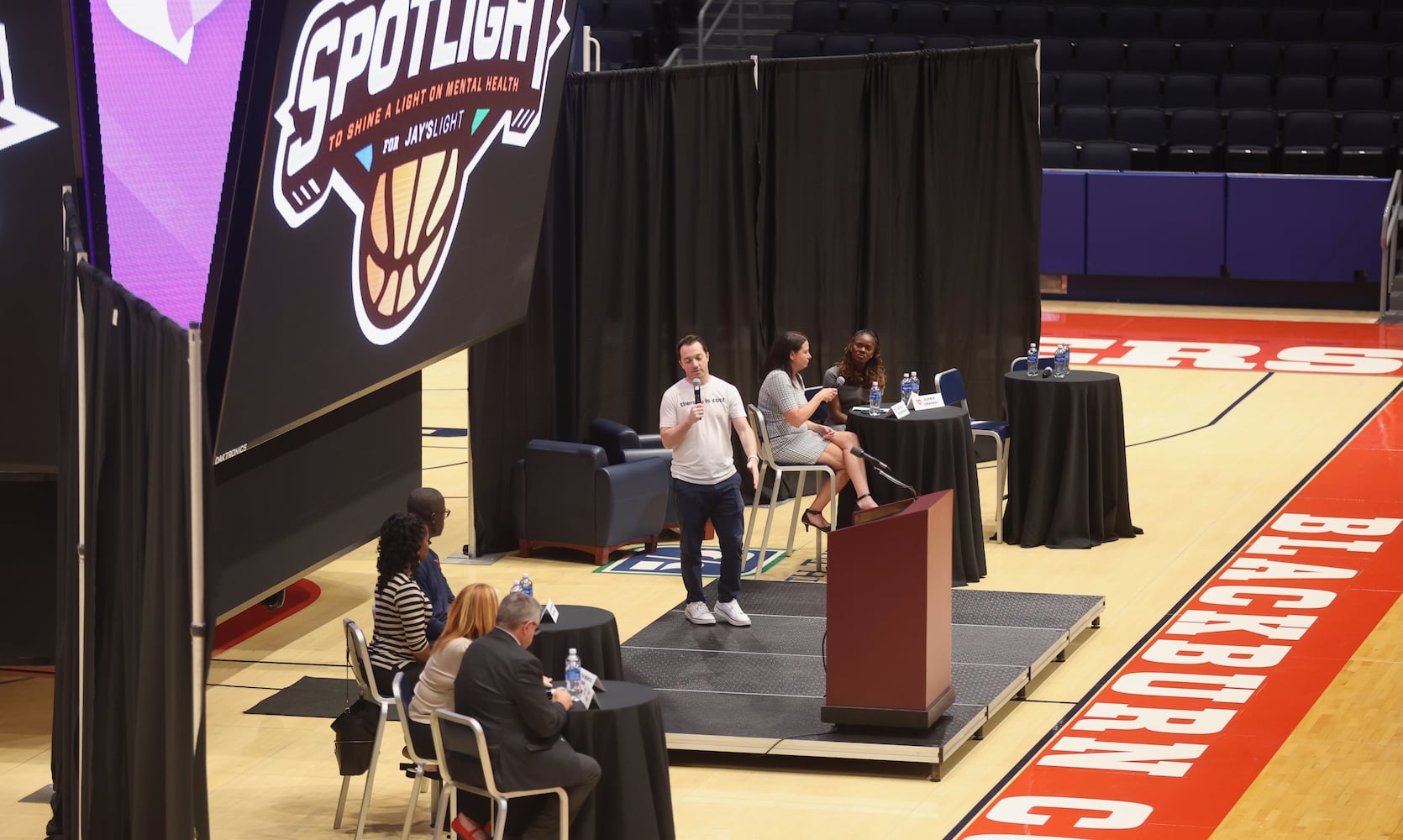 Dayton Athletic Director Neil Sullivan speaks at The Spotlight Town Hall, a mental health event, on Wednesday, Oct. 9, 2024, at UD Arena in Dayton. David Jablonski/Staff