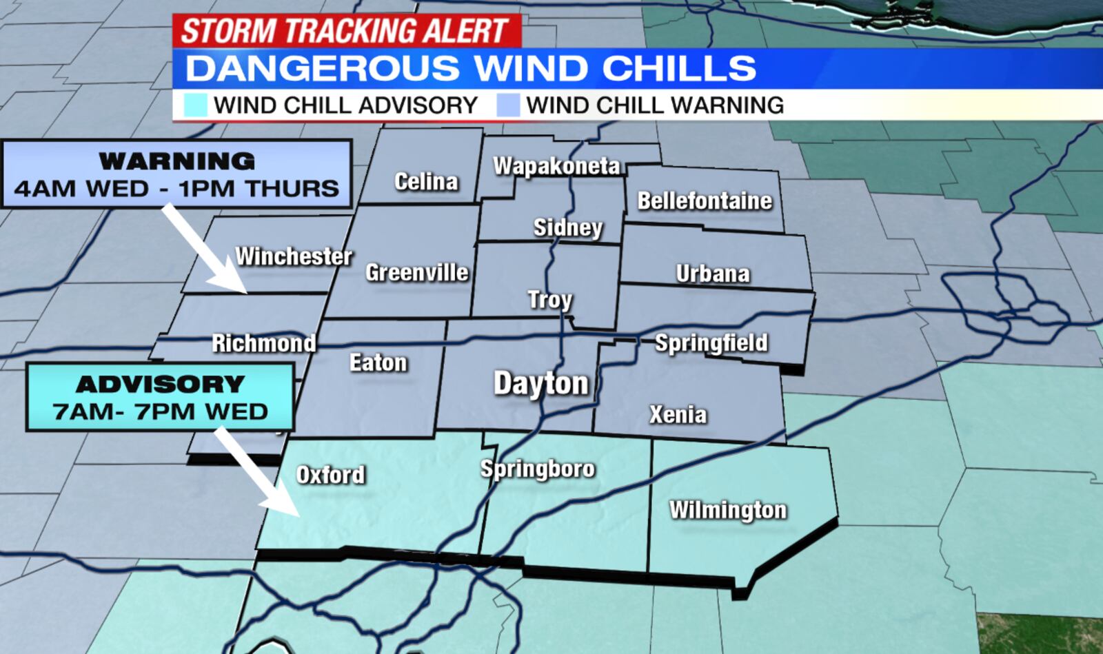 A Wind Chill Warning goes into effect at 4 a.m. Jan 30 to 1 p.m. Jan. 31 for Auglaize, Champaign, Clark, Darke, Greene, Logan, Mercer, Miami, Montgomery, Preble, Shelby and Wayne (Indiana) counties, and from 10 p.m. Jan. 29 through 1 p.m. Jan. 31 for Randolph County, Ind. Wind chills as low as 30 below zero are expected with winds gusting as high as 25 mph.