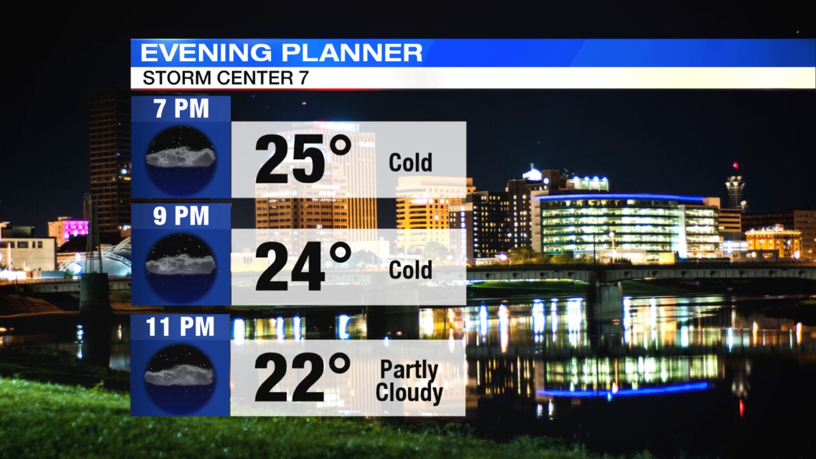 Tonight: Dry and cold as we head into the night. Mostly cloudy skies with lows near 21.