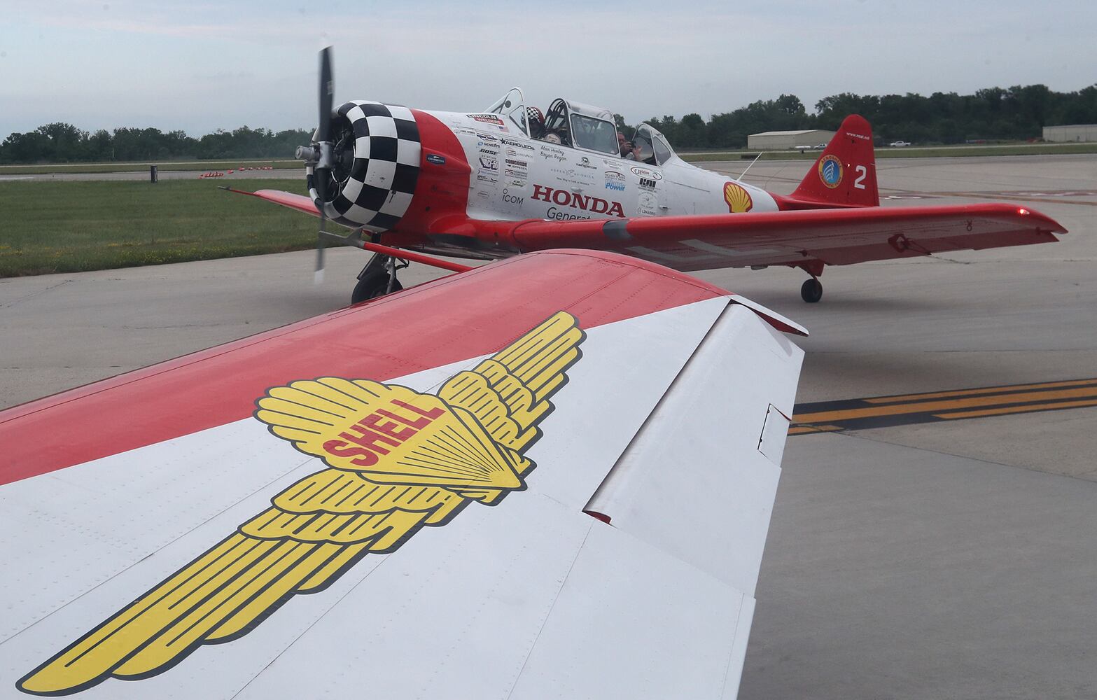 The Aeroshell Aerobatic Team performs a fly over of Vandalia and the Air Show Parade Friday evening. The Aeroshell team, consisting of four T-6 airplanes, will be performing at the CenterPoint Energy Dayton Air Show Satuday and Sunday. BILL LACKEY/STAFF
