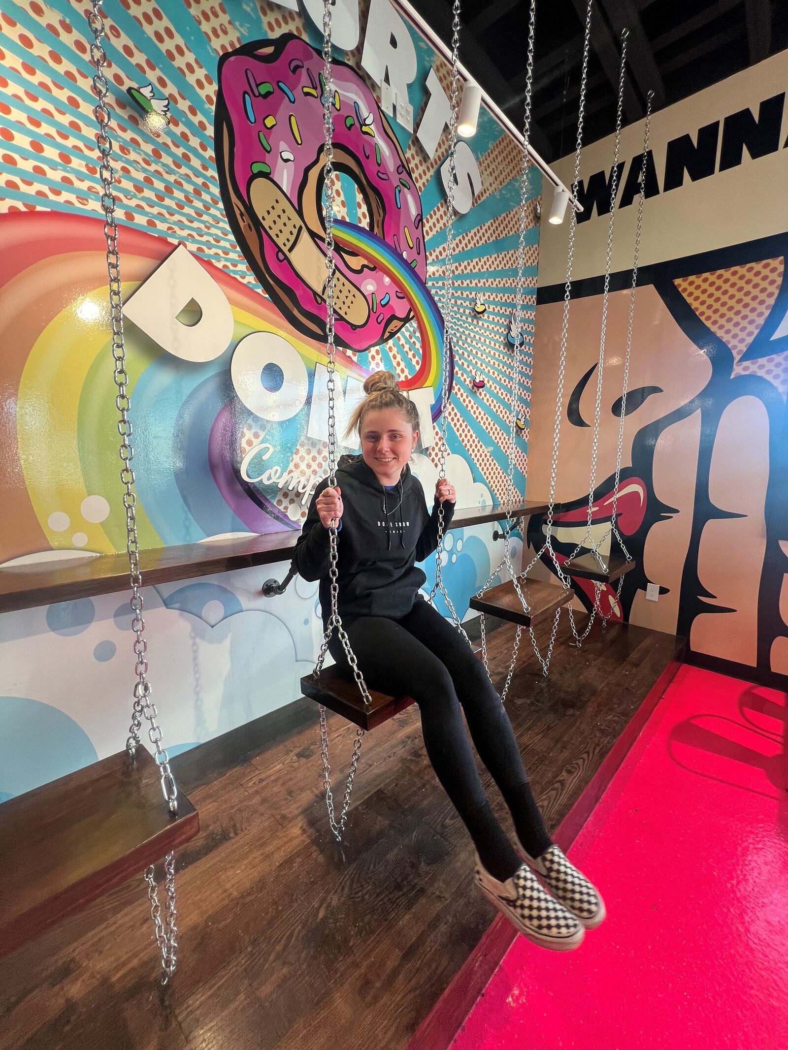 I personally love the vibe of the donut shop. The bright colors and “swings” makes it the perfect Instagrammable spot.