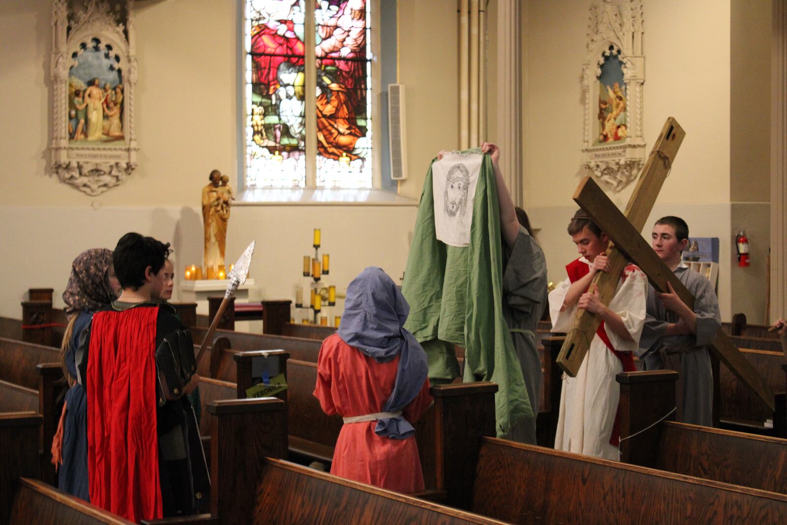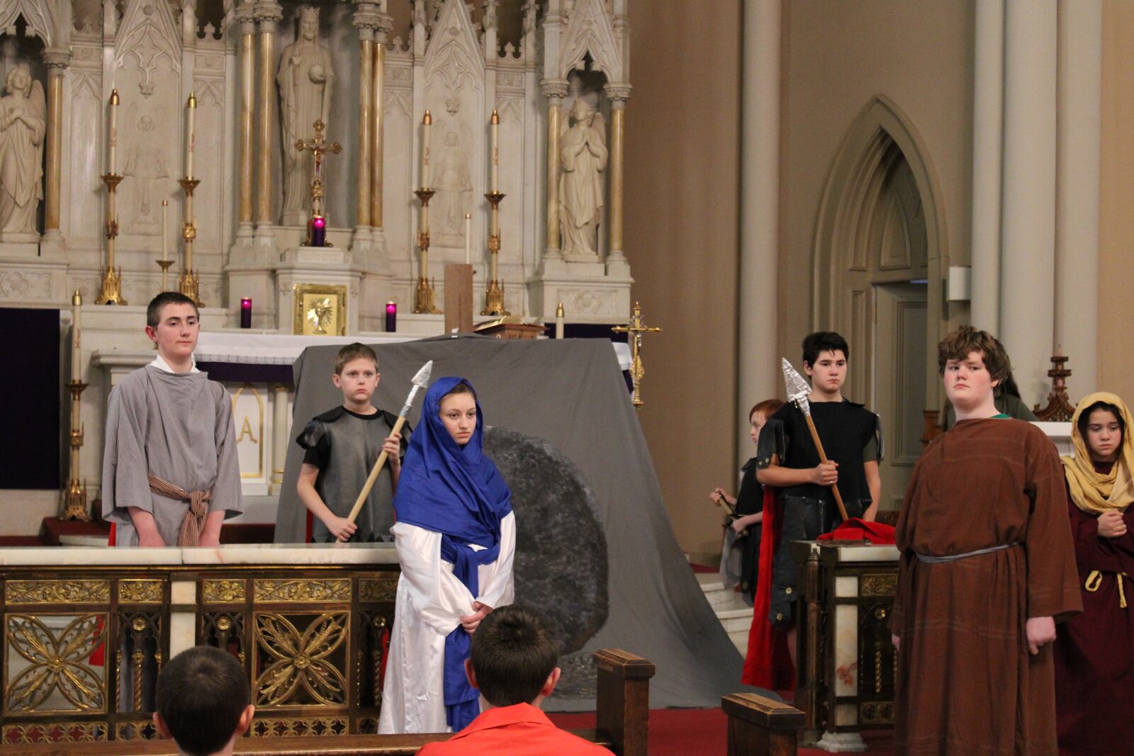 One of the eagerly anticipated Lentin events at Emmanuel Catholic Church in Dayton is an annual dramatic reenactment by young church members incorporating narration, meditations, acting and song. Thirty children, dressed in tunics created by volunteer moms, participated this year.